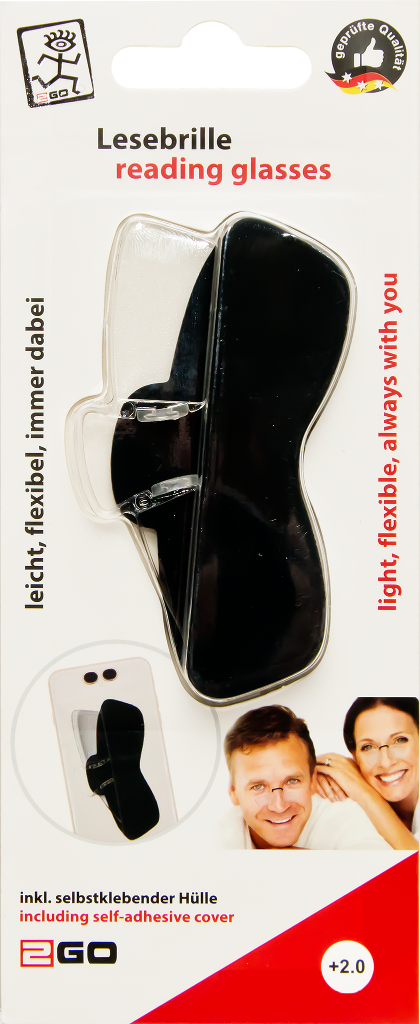 Die 2GO Lesebrillen werden mit einem passenden Etui geliefert, welches mit dem beiliegenden, selbstklebenden und wiederverwendbaren* Sticker auf jeder glatten Oberfläche befestigt werden kann (z.B. auf der Rückseite Ihres Smartphones). (*Der Sticker kann unter fließendem Wasser gereinigt und erneut verwendet werden.)